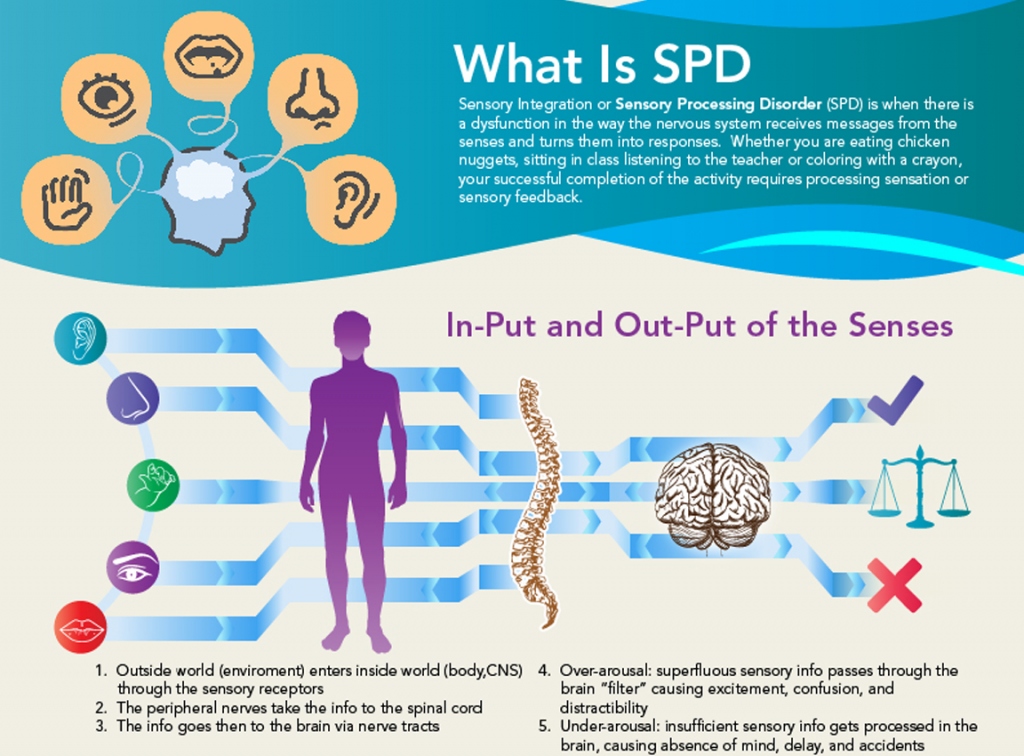 Sensory integration or Sensory Processing Disorder (SPD) refers to how people use the information provided by all the sensations coming from within the body and from the external environment. In contrast, sensory integrative dysfunction is a disorder in which sensory input is not integrated or organized appropriately in the brain and may produce varying degrees of problems in development.